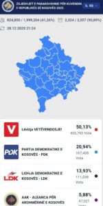 Sipas 95.58 përqind tê numërimit tê votave Vetëvendosja bie nên 50 pêrqind të votave , pra 49.79 përqind.