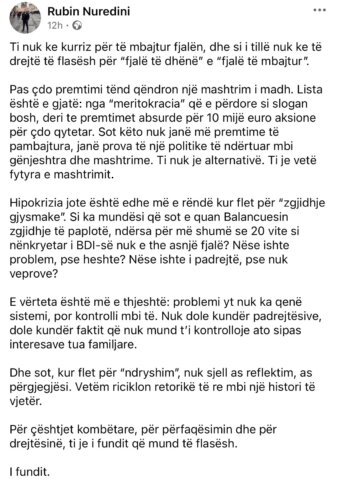 Hipokrizia jote është edhe më e rëndë kur flet për “zgjidhje gjysmake”. Si ka mundësi që sot e quan Balancuesin zgjidhje të paplotë, ndërsa për më shumë se 20 vite si nënkryetar i BDI-së nuk e the asnjë fjalë? Nëse ishte problem, pse heshte? Nëse ishte i padrejtë, pse nuk veprove?